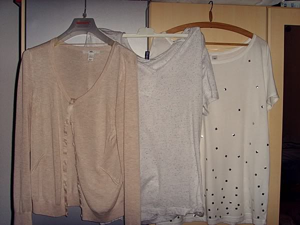 hautfarbener Cardigan (15€), ''Recycling T-Shirt'' wie V es immer nennt (5€) , nietenbesetztes Shirt (5€) aus H&M